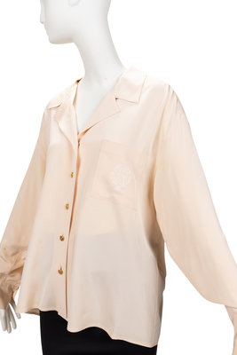 Cream silk box cut blouse with notched lapel, long sleeves, front breast pocket with embroidered detail, and front button closure.
