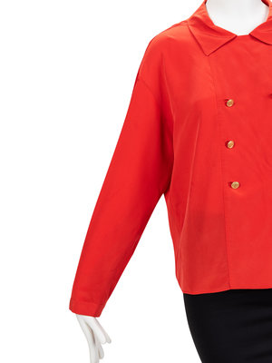 Red silk double breasted box cut blouse with fold collar, long dropped sleeves, and double front gold-tone button closure.