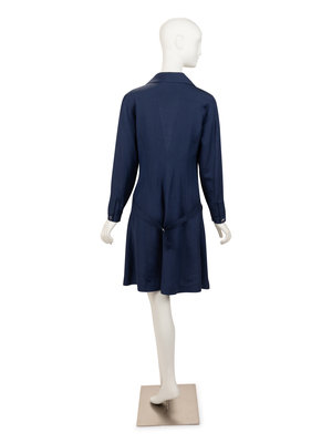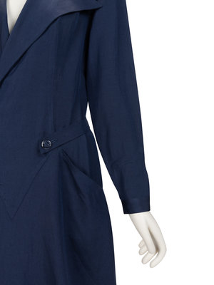 Blue silk wrap dress with notched peak lapel, set in long sleeves, two slit pockets, and detachable half belt.