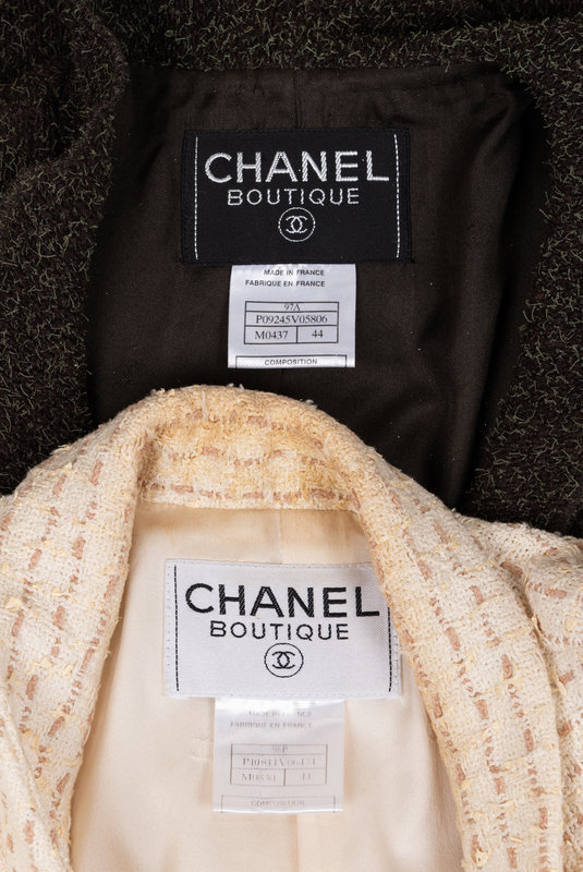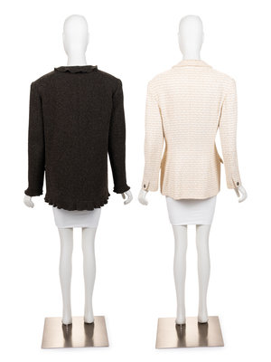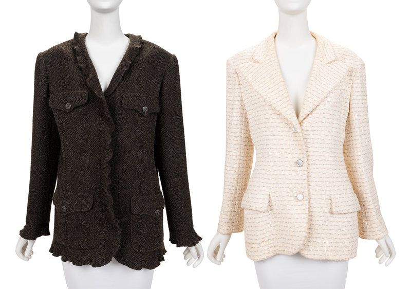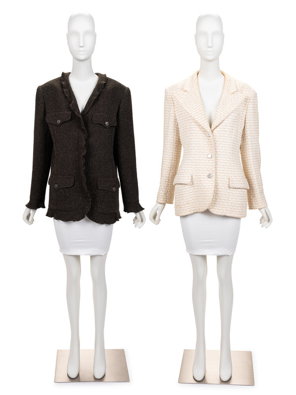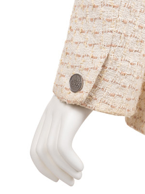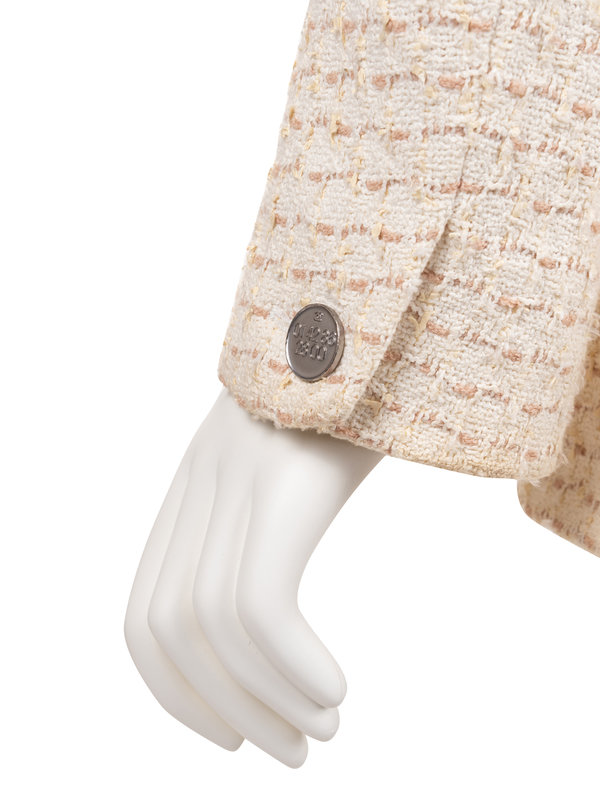 White and beige tweed jacket with notched lapel, set in long sleeves, faux welt chest pocket, two front flap pockets, and front button closure. 1998