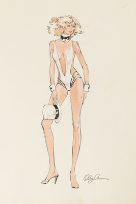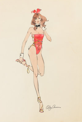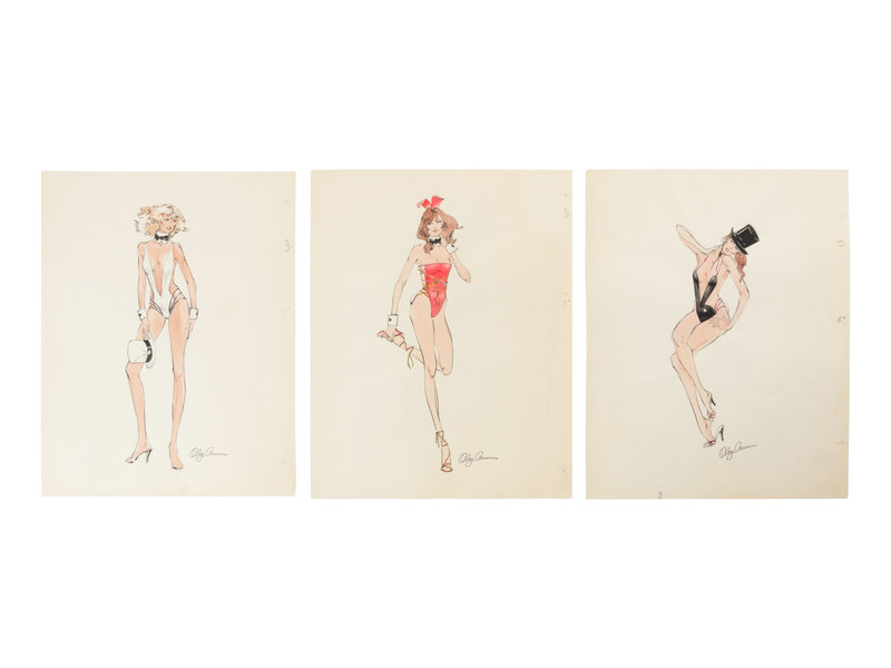 These sketches were commissioned by Playboy and included in the October 1979 issue of Playboy Magazine (pages 225-227) in a feature titled “Hare Apparel.” Designers Giorgio di Sant’ Angelo, Bonnie August, Bill Blass, Oleg Cassini, Castelbajac, Edith Head, Fernando Sanchez, and Monika Tilley created their versions of the Playboy bunny costume. Playmate Candace Collins can be seen modeling some of the designs in the feature.