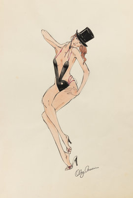 Illustration of a woman wearing a black bunny shaped bodysuit, heels, and top hat. Signed by Oleg Cassini. Notice the body suit is in the shape of the head of a bunny with clever use of the 'whiskers'.