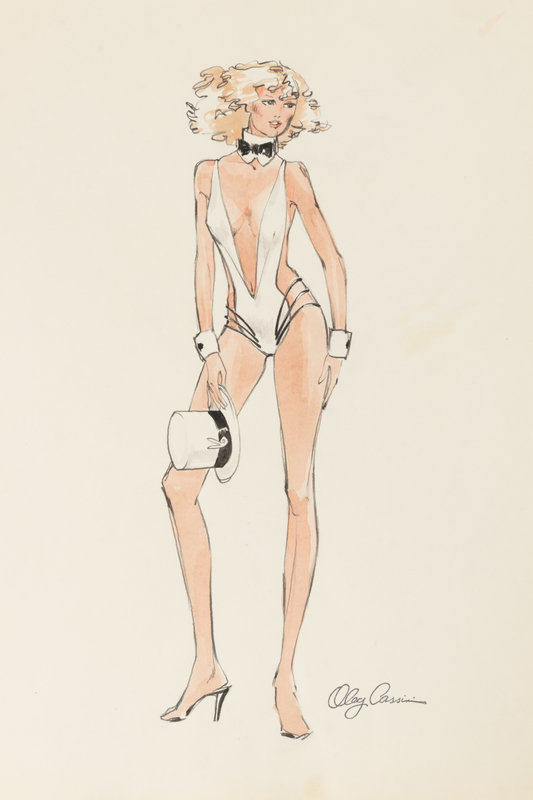 Illustration of a woman wearing a white body suit, choker, and hat. Signed by Oleg Cassini. Notice the body suit is in the shape of the head of a bunny with clever use of the 'whiskers'.