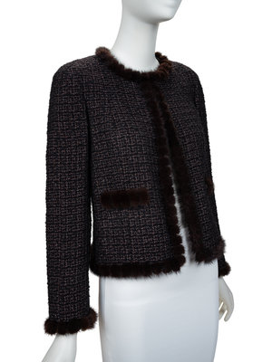 Black wool and mohair jacket with mink trim, jewel neckline, set in long sleeves, two front faux pockets, and single hook and eye front closure.