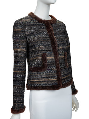Brown, grey, and gold wool jacket with jewel neckline, set in long sleeves, rabbit fur trim, two front slit pockets, and hook and eye front closure.