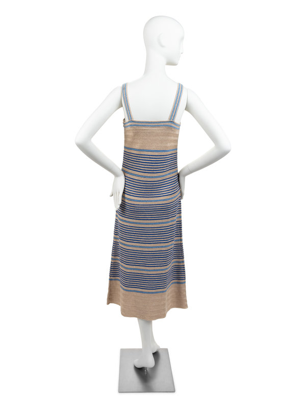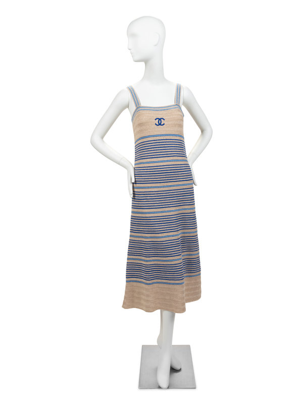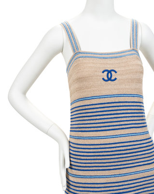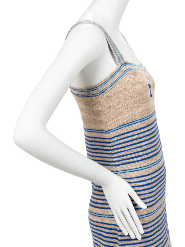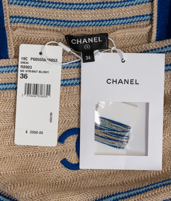Tan linen/cashmere blend woven sleeveless midi dress with dual blue stripes, embroidered 'CC' logo on the center front, gold-tone thread detailing, and invisible side zipper closure. Item retains merchandising label listing the retail price at $2,550.00. The item also comes with extra yarn for repairs.