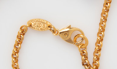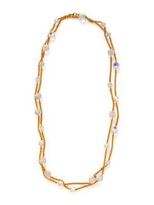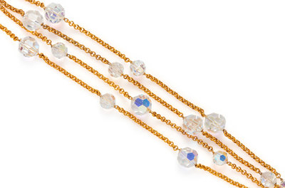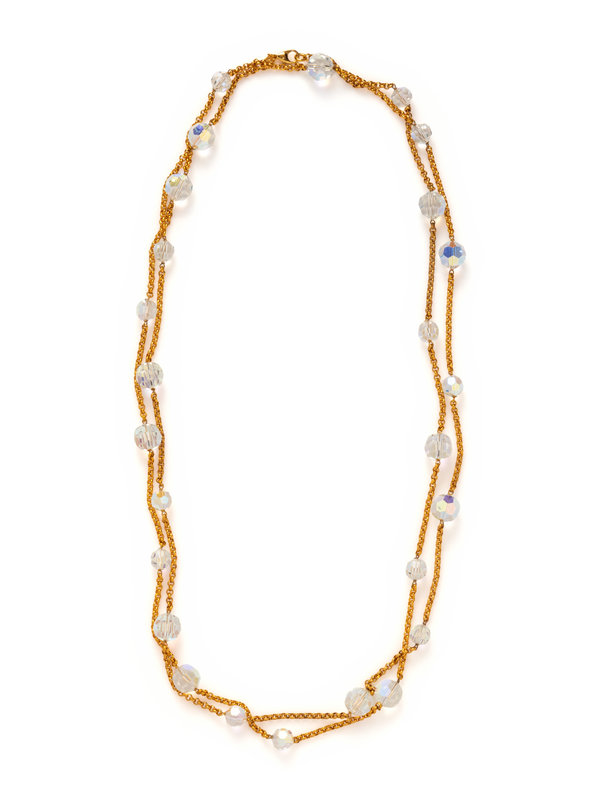 Gold-tone metal double stranded long necklace with clear beads and lobster claw closure.