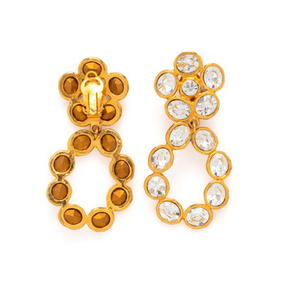 Gold-tone metal clip on dangle earrings with encrusted rhinestones in a floral shape.