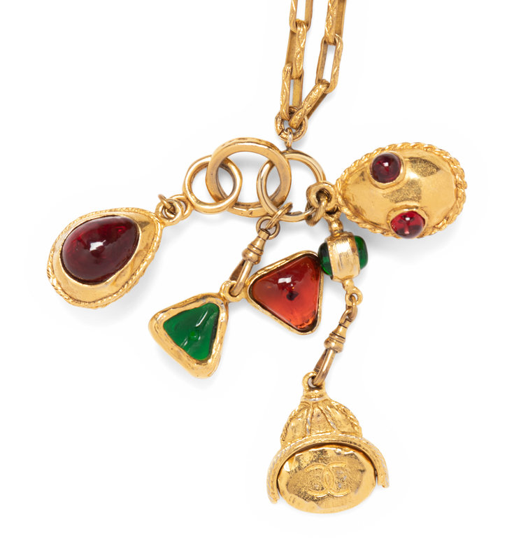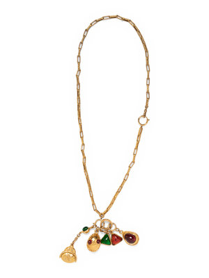 Gold-tone metal necklace with multiple gold-tone and multicolored glass bead pendants and spring ring closure.