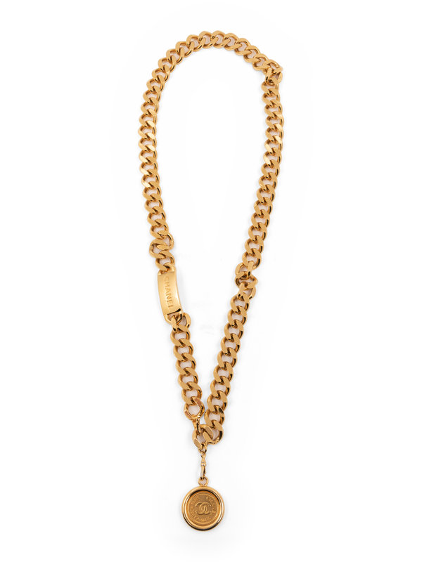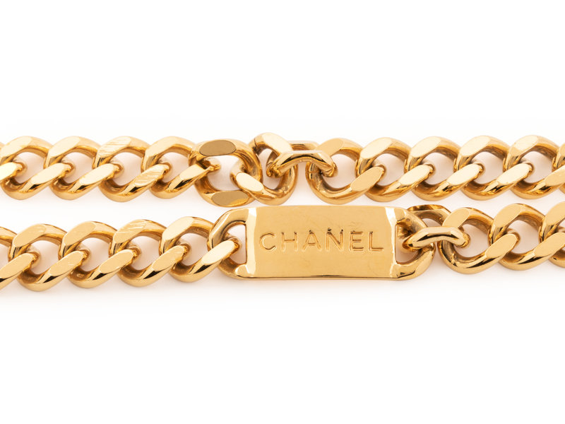 Gold-tone metal chain belt with engraved CHANEL plate and CC medallion.