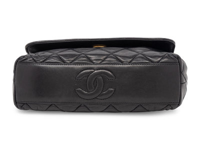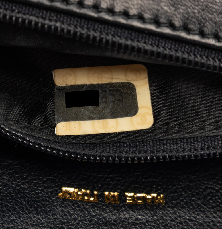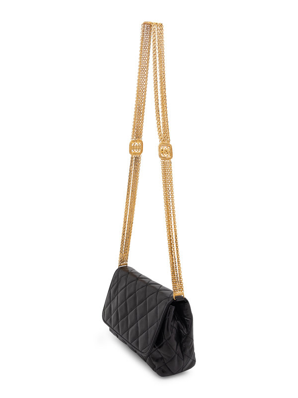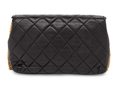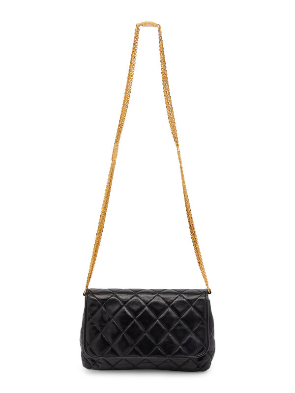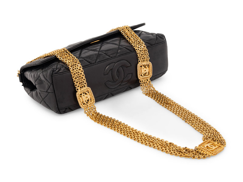 Black quilted leather flap bag with multi stranded gold-tone chain strap with "CC" pendants, main interior compartment with zippered pocket, and front snap closure.