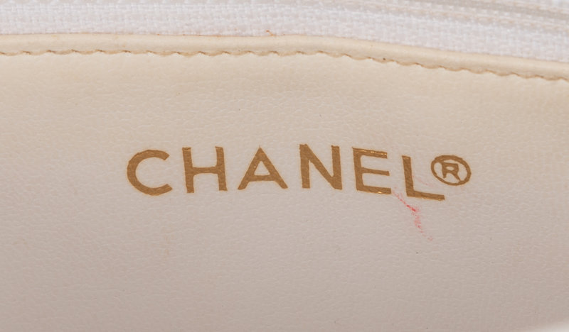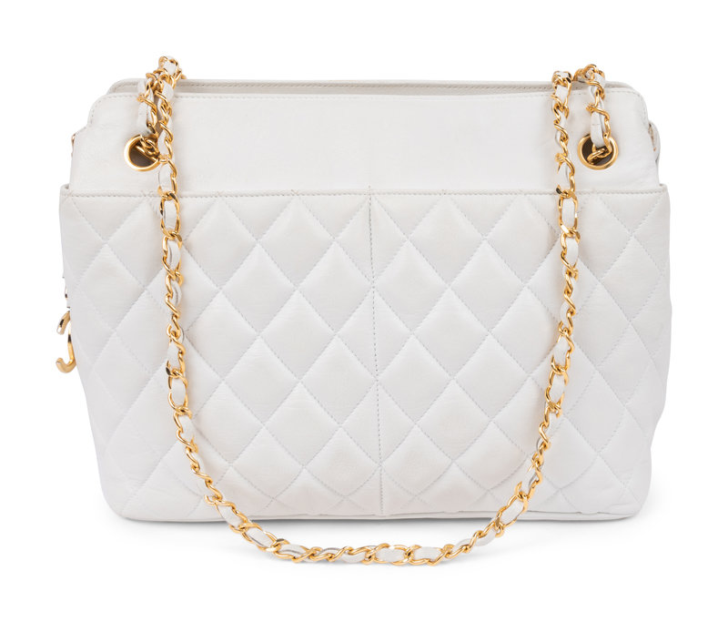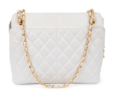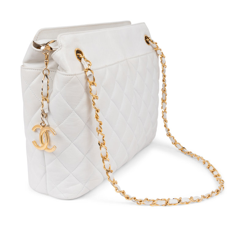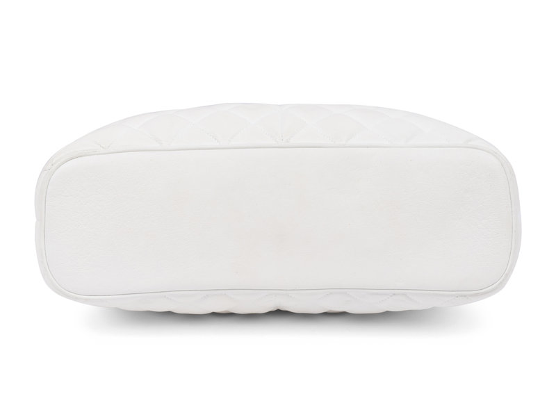 White quilted leather bag with two front and back slit pockets, dual white leather shoulder straps laced through a gold-tone metal chain, one main interior compartment with two zippered pockets, and top zipper closure.