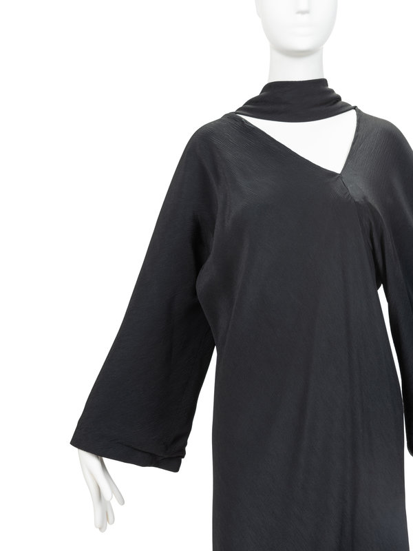 Black knit crepe dress with an asymmetrical v-neckline, long sleeves, with loops around the neckline to hold matching crepe scarf.