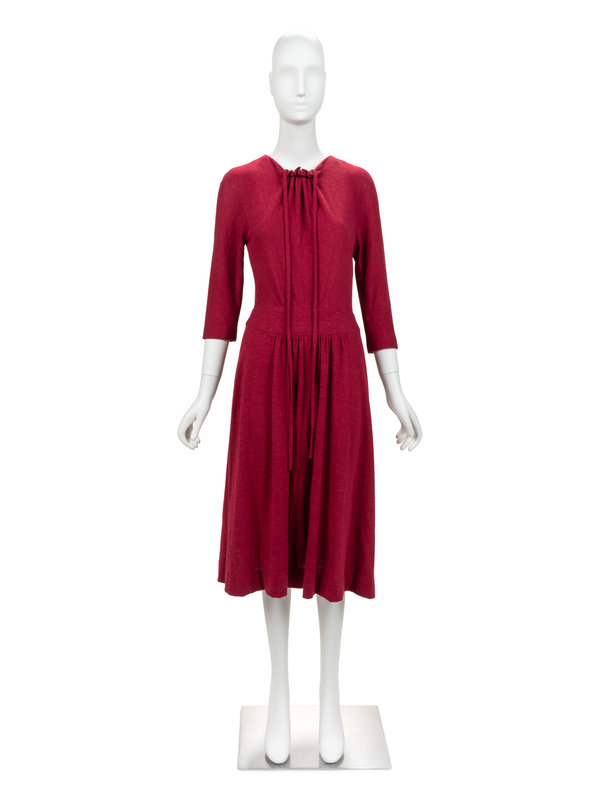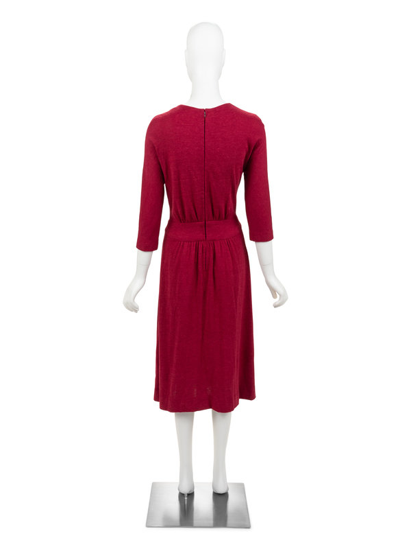 In the 1930s, Madame Grès (1903-93) became known for her exquisitely draped, bias-skimming gowns. The successful label adapted, over decades, to changing styles and eventually producing modern cuts for women in the 1970s and 80s. This simple day dress features refined cuts and quiet elegance in ultimate simplicity.
