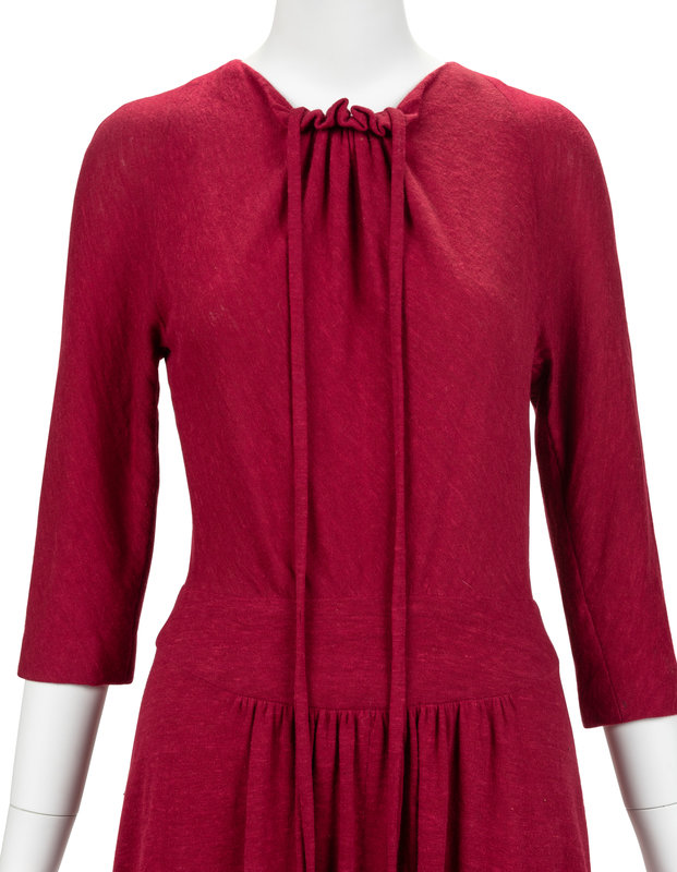 Haute Couture red jersey knit midi dress with crew neckline, center front ruffle detail with attached neck tie, raglan long sleeves, gathered front waist band, and center back zipper closure.