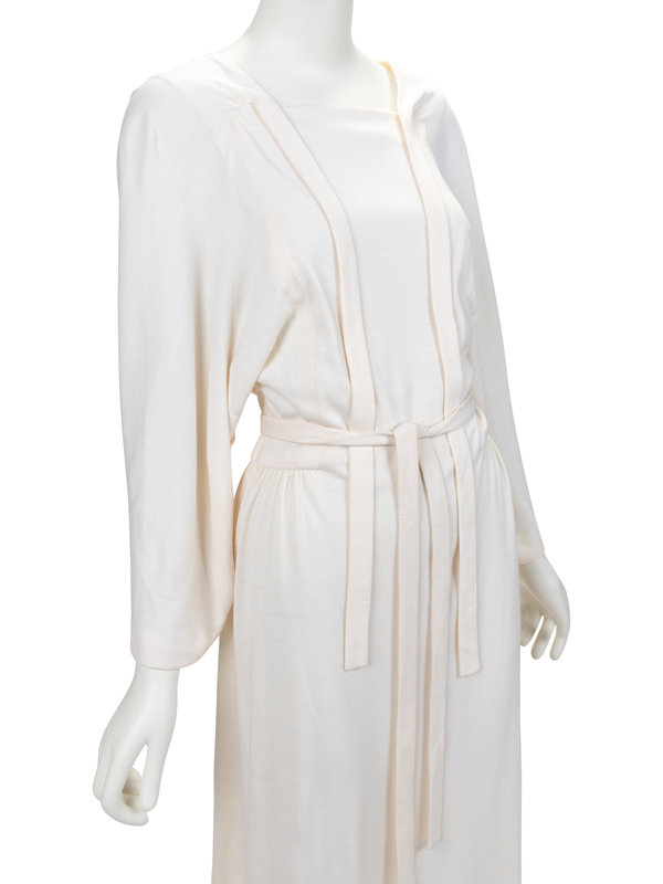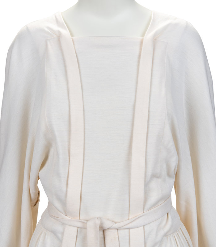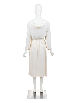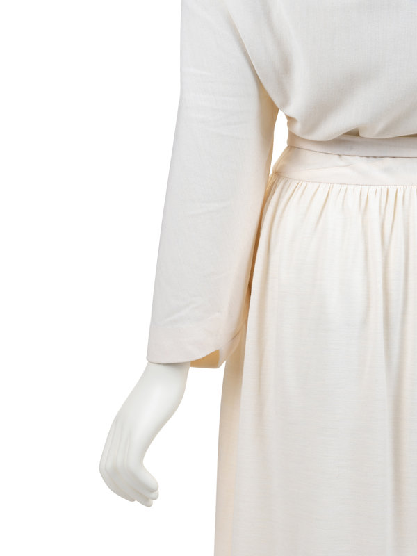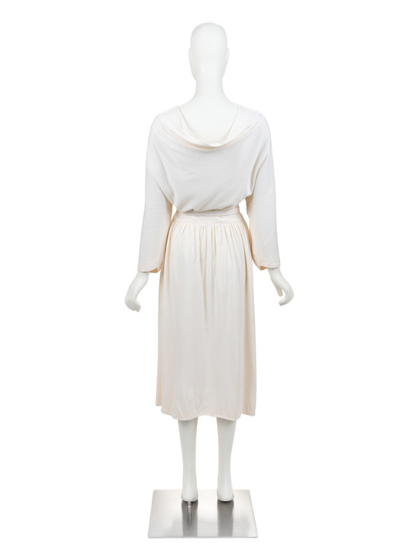 Haute Couture cream cashmere midi dress with attached neck tie, draped back neckline, raglan long sleeves, gathered back waist line, side zipper closure with snaps, and matching cream cashmere belt. The unmarked pin (featured in the last image) comes with the dress, but it remains uncertain if it was original to the design.