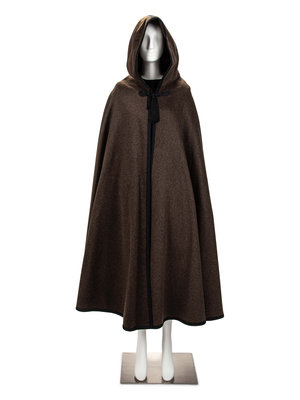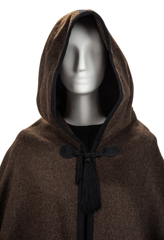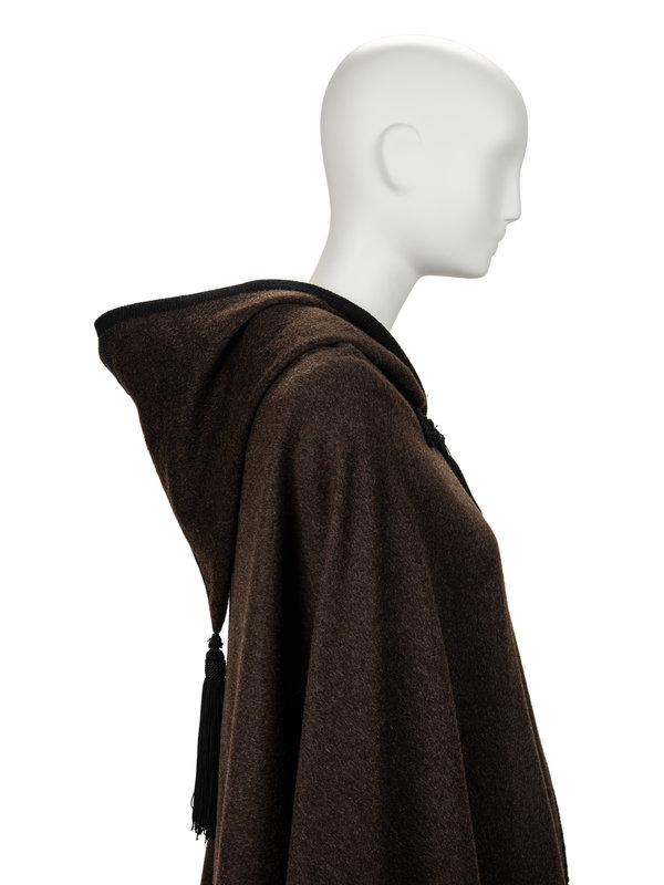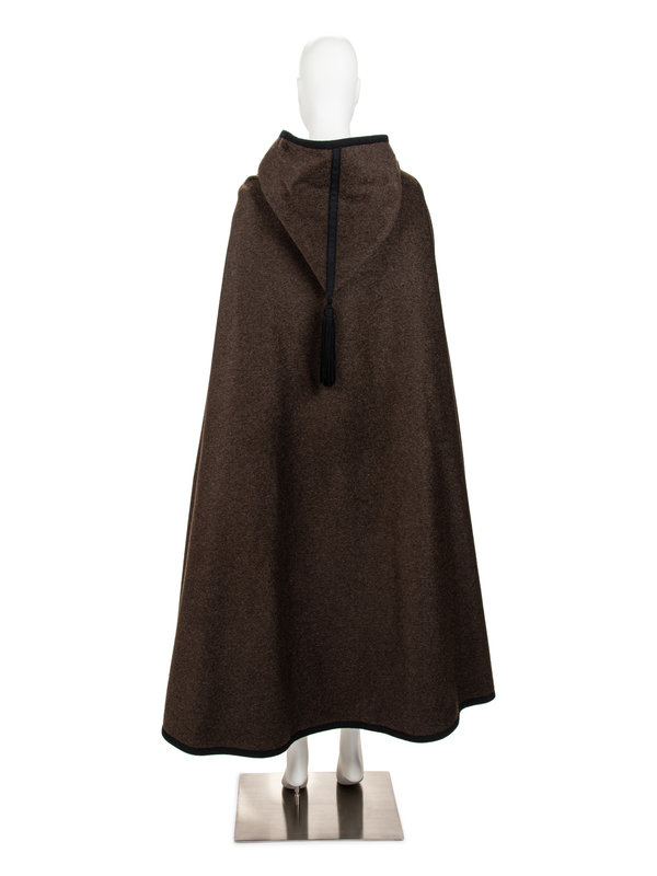Brown hooded wool cape with braided black trim, black tassel, and black cord and tassel single front closure.