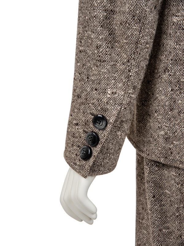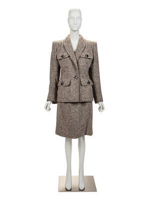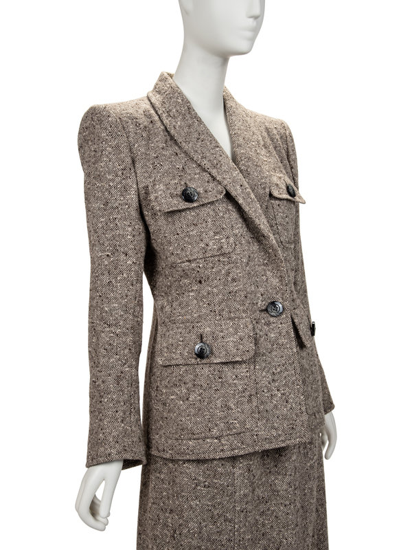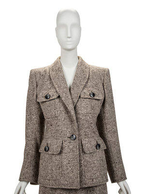 Grey, brown, and cream wool single breasted haute couture jacket with shawl lapel, set in long sleeves, four front buttoned flap pockets, and front button closure; paired with matching skirt.