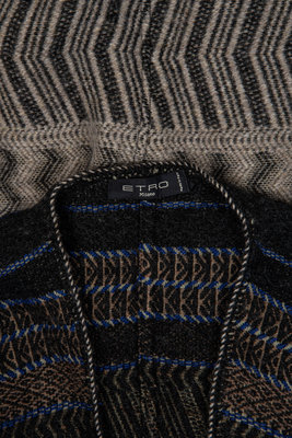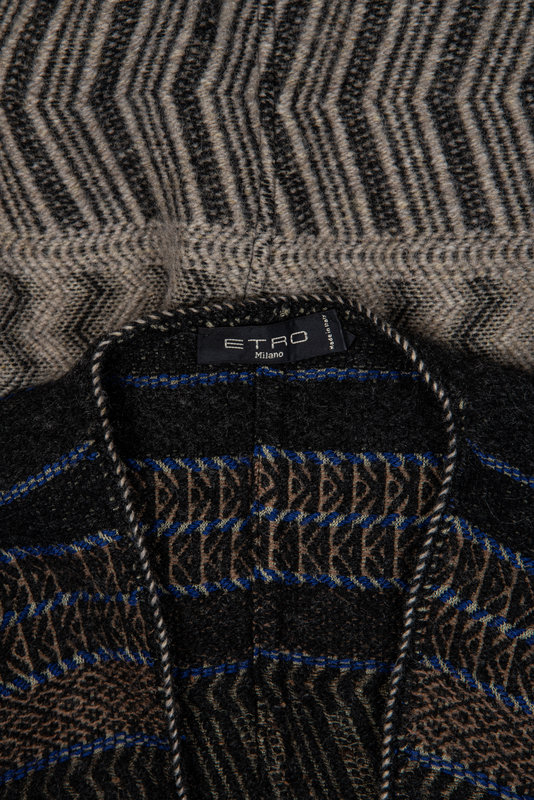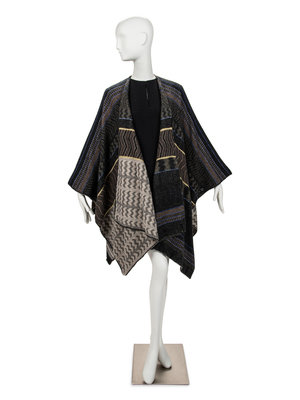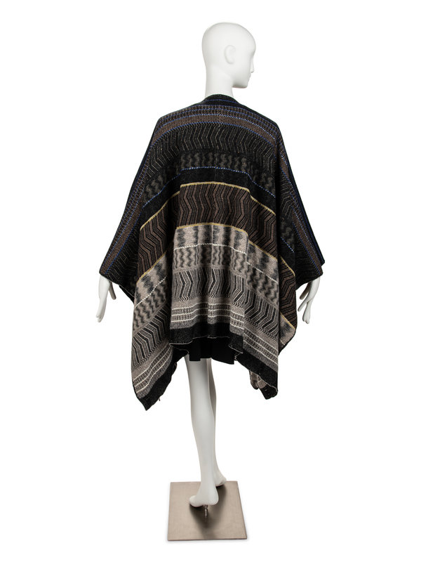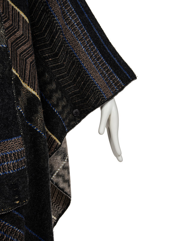 Multicolored cashmere/silk blend knit poncho with paneled chevron and striped pattern and single button closure.