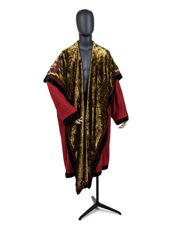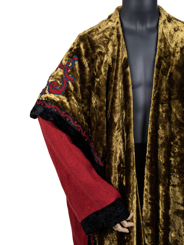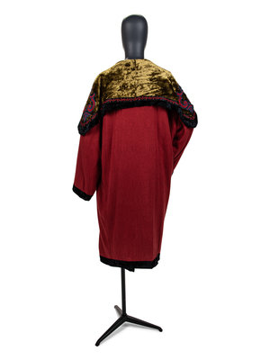 Red cashmere/silk blend evening coat with gold velvet lining and fold over collar, set in long sleeves, black velvet trim with red and blue embroidery, and open front.