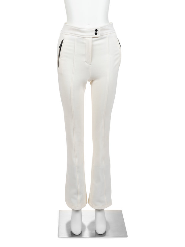 Cream knit snow pants with black ankle gaiters, two faux front hip zippered pockets, and a front zipper and snap closure.