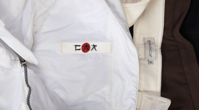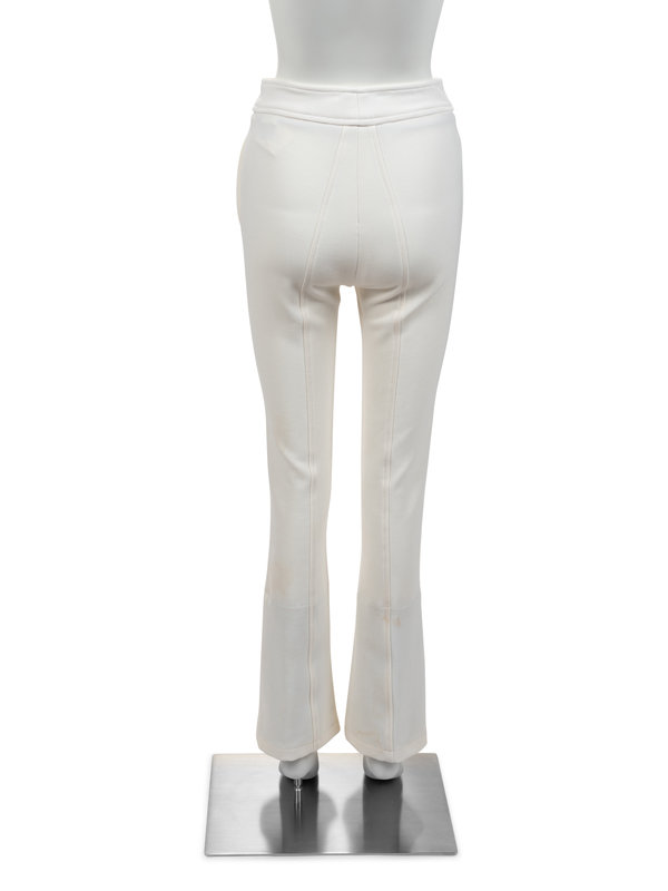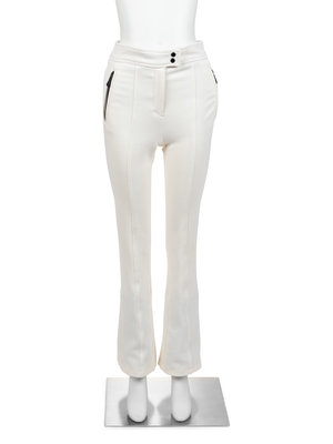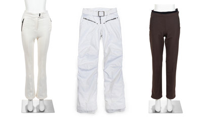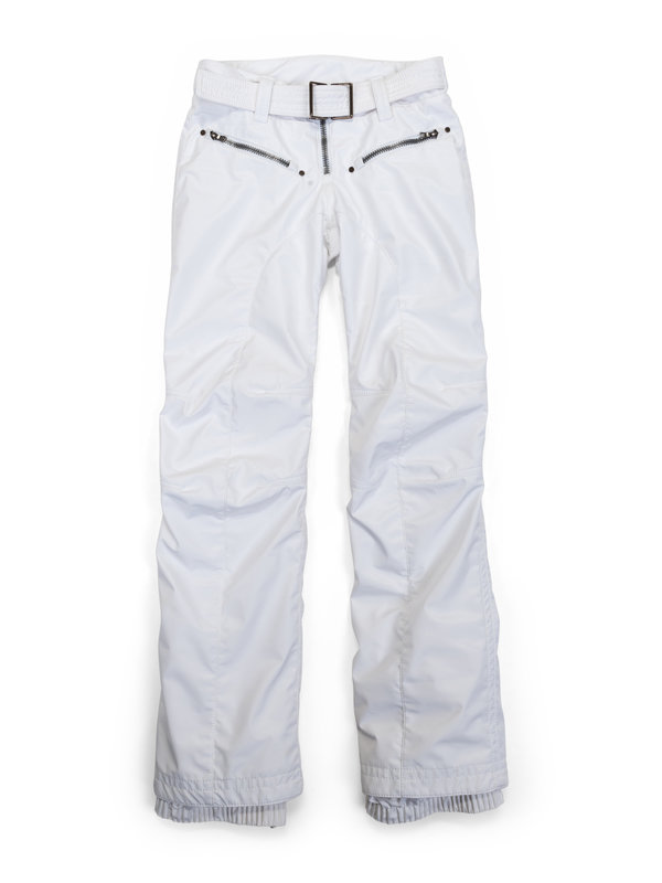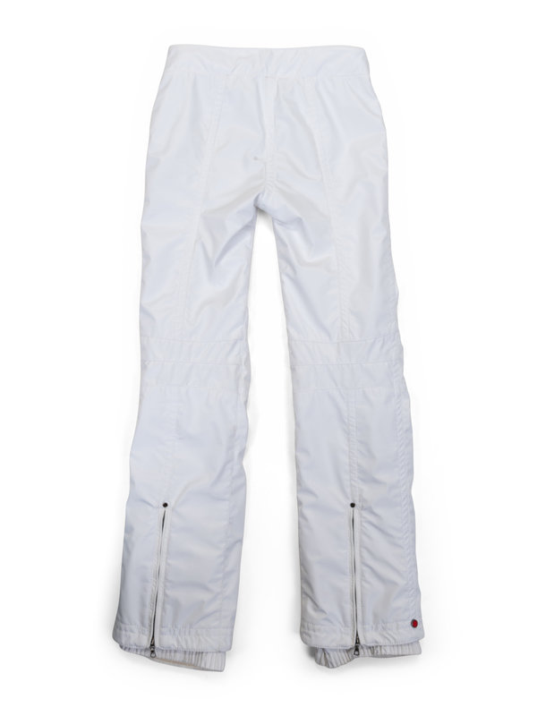 White polyester snow pants with gathered seams, ankle gaiters with zippers, two front hip zippered pockets with a center front zipper closure and attached half belt.