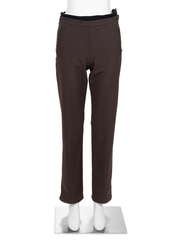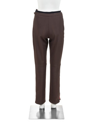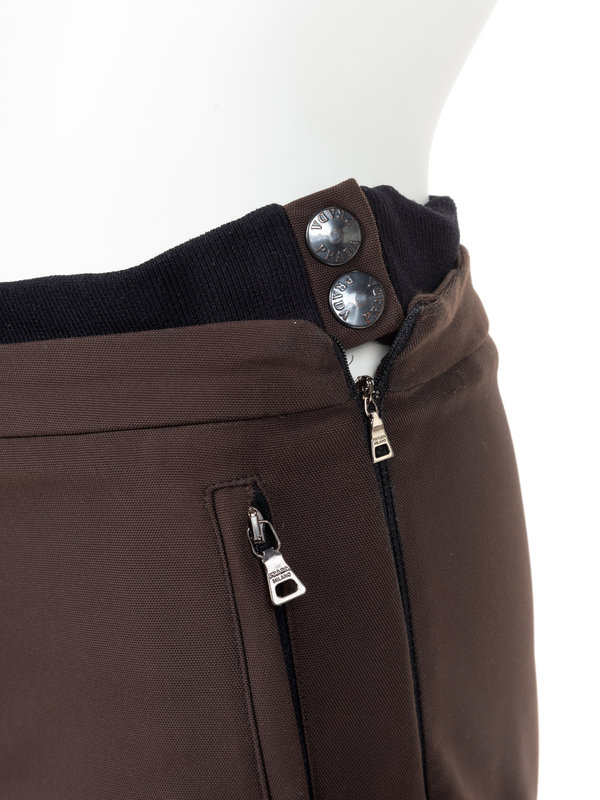 Brown nylon/polyester blend snow pants with a black extended elastic waist band, two front hip zippered pockets, ankle zippers, and a side button and zipper closure.