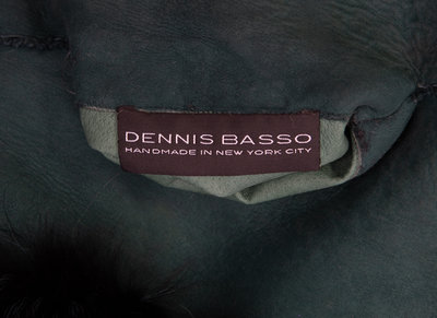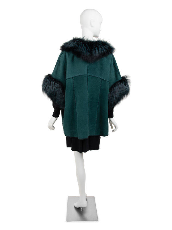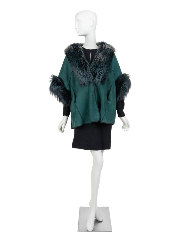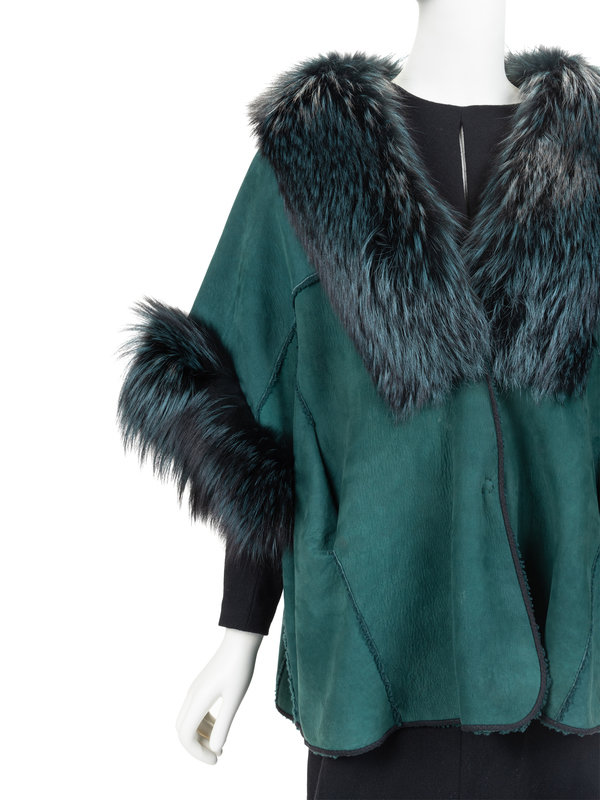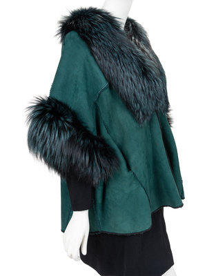 Green suede box cut jacket with black and green mink fur trim, green shearling lining, short sleeves, two front hip slit pockets, and a center front snap closure.