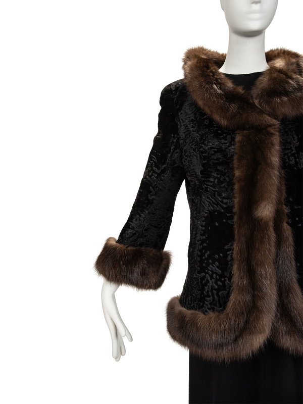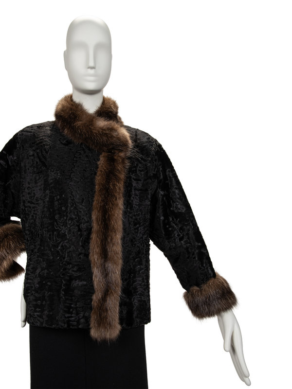Black broadtail lamb jacket with sable trim and cuffs, set in long sleeves, two side slit pockets, and a single hook and eye front closure.