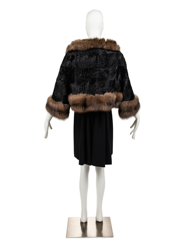 Black lambs wool cropped jacket with brown fur trim, flared short drop sleeves, and an open front.