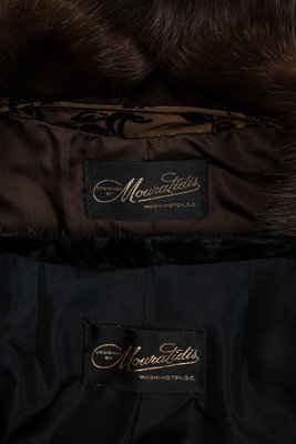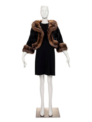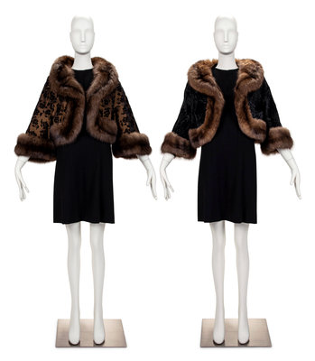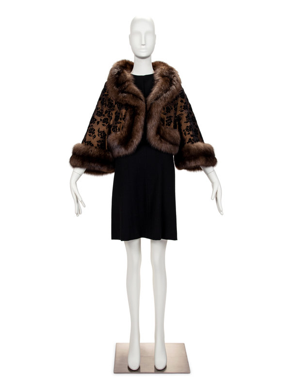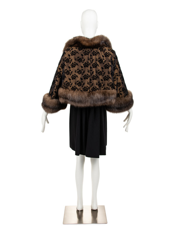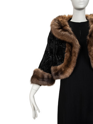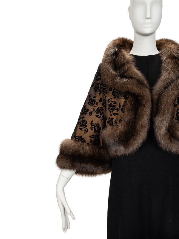 Irridicent flocked taffeta cropped jacket with brown fur trim, flared short drop sleeves, and an open front.