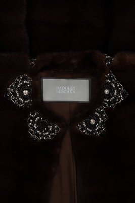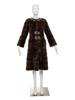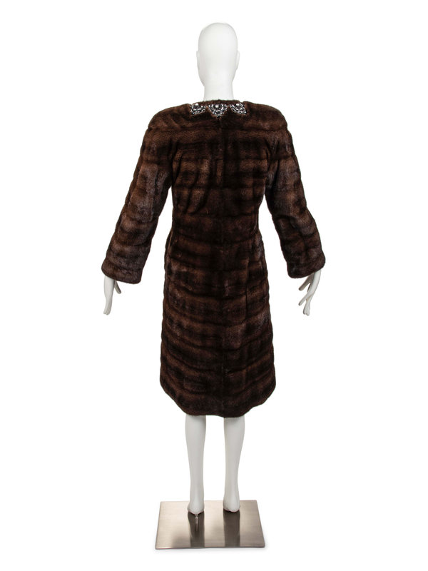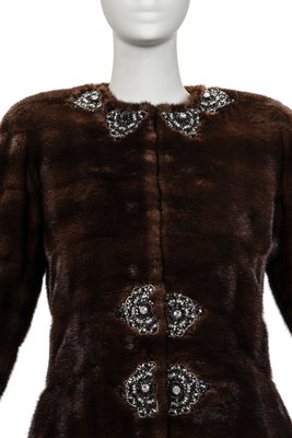 Brown mink fur coat with crew neckline, two side slit pockets, rhinestone embellishments around neckline and opening, with a hook and eye front closure.
