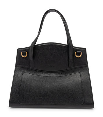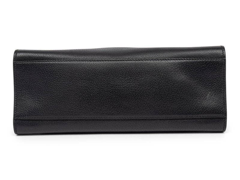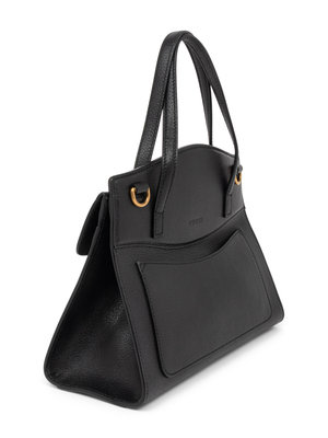Black leather totem bag with center front crystal encrusted butterfly, Sylvie trim detail, one main compartment with slit and zipper pocket, two leather handles, detachable canvas shoulder strap, and magnetic and clasp closure.