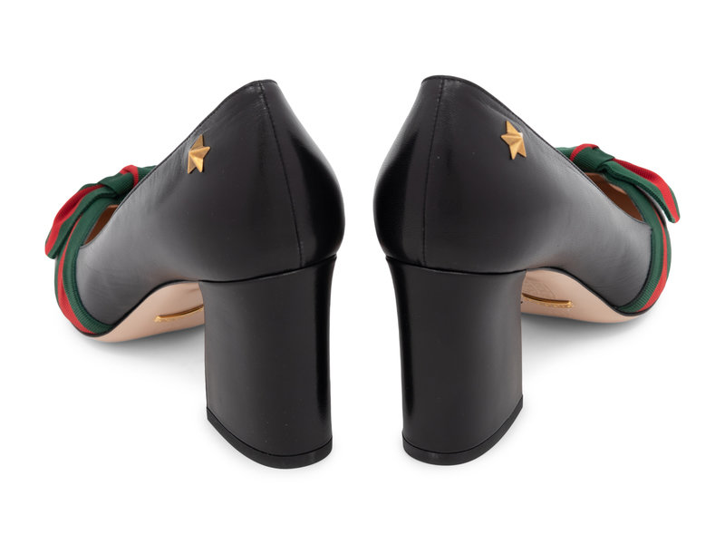 Unworn black leather pumps with red and green Sylvie bow accent, block heels, and embellished gold-tone star detail.