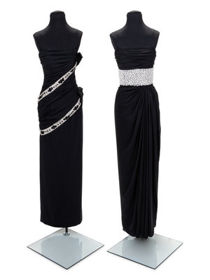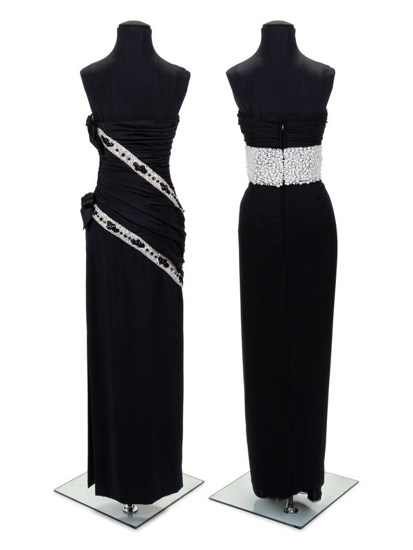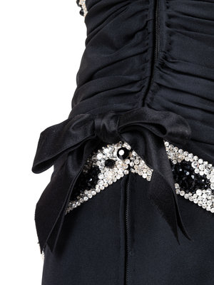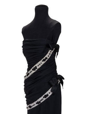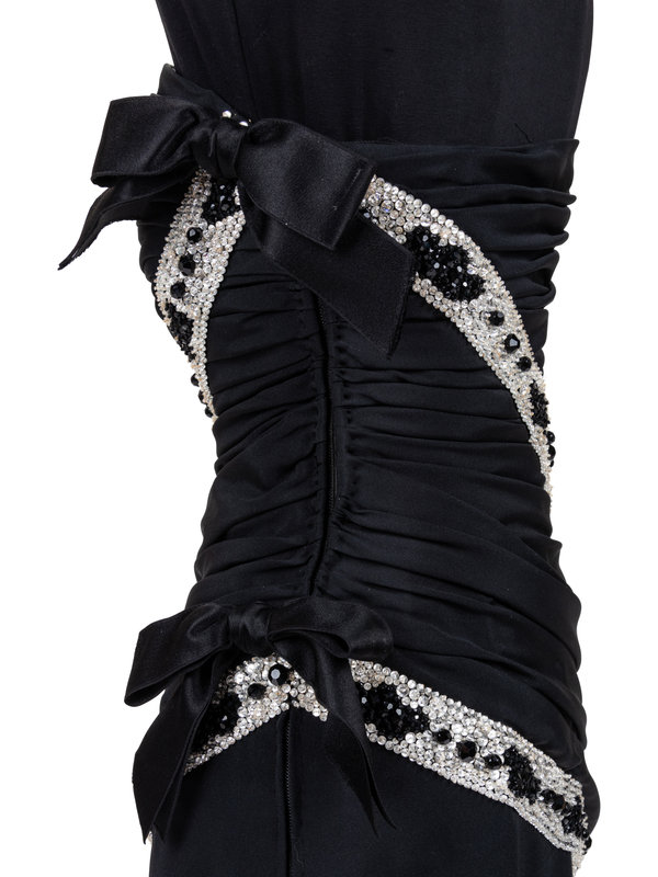 Black silk strapless dress with gathered and ruched torso, two left side seam large black satin bows, two black and clear beaded diagonal stripes wrapping around the body, side slit, and side zipper closure.