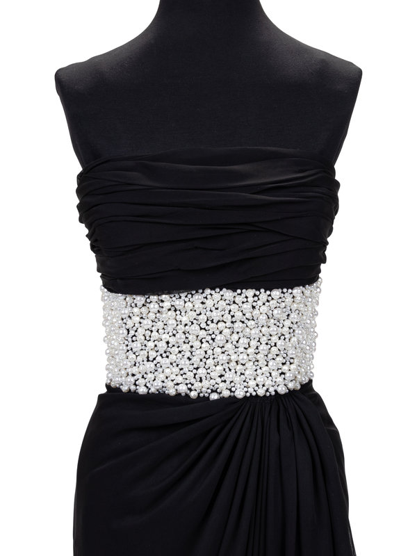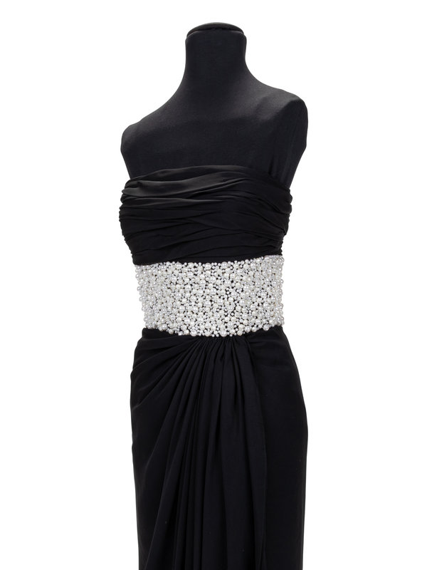 Black chiffon strapless dress with ruched bust, faux pearl covered waist band, draped detailing on the skirt, and center back zipper closure.