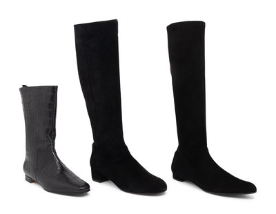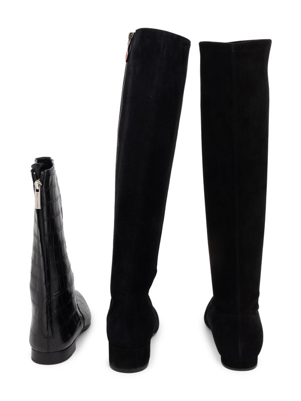 Black suede tall boots with an exposed side zipper closure and rounded toe.