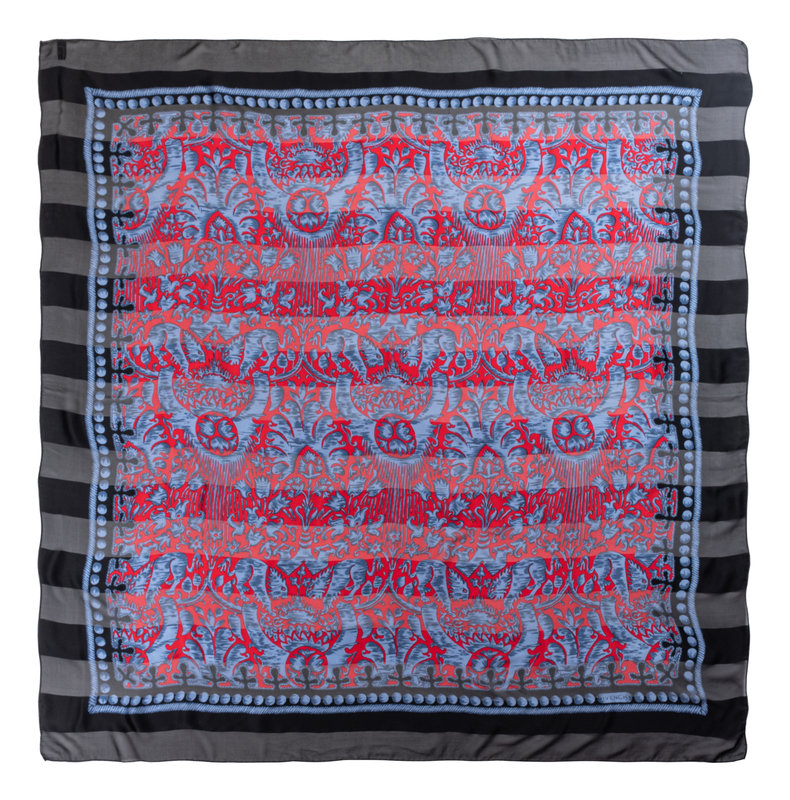 Red and blue silk scarf with geometric and floral print, bordered by dual black tone stripes.