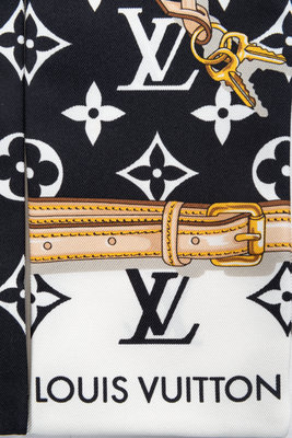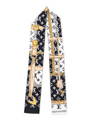 Black and white monogrammed silk thin scarf with gold chain and tan clochette detailing.