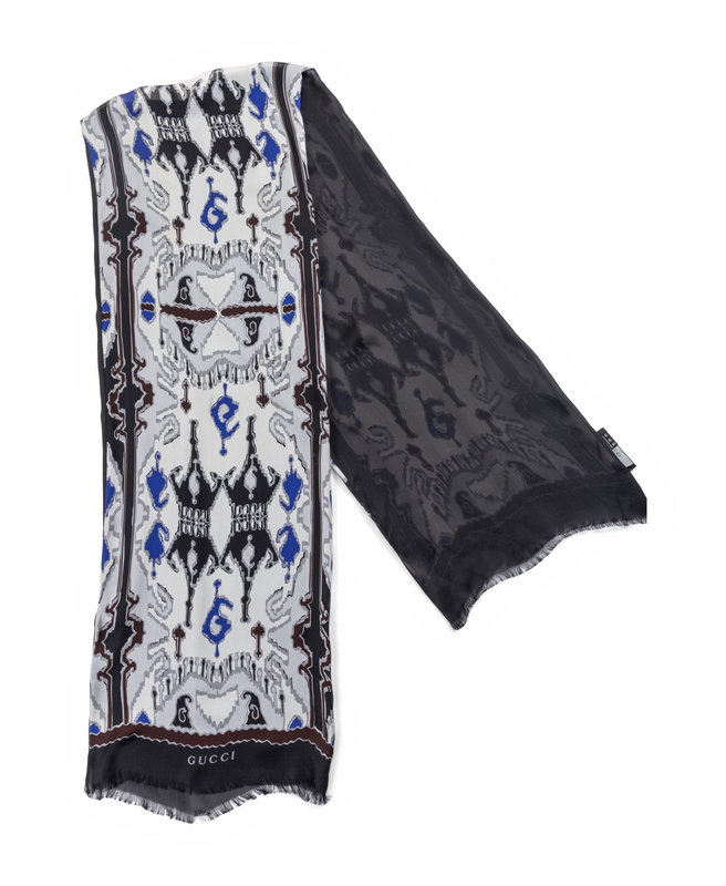 Long black and white silk scarf with grey, royal blue, and brown geometric print with frayed edges.