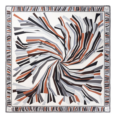 White silk scarf with grey and burnt orange geometric pattern.