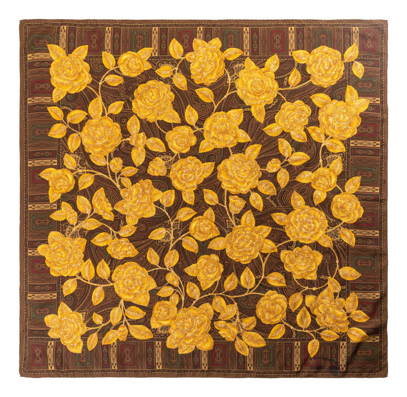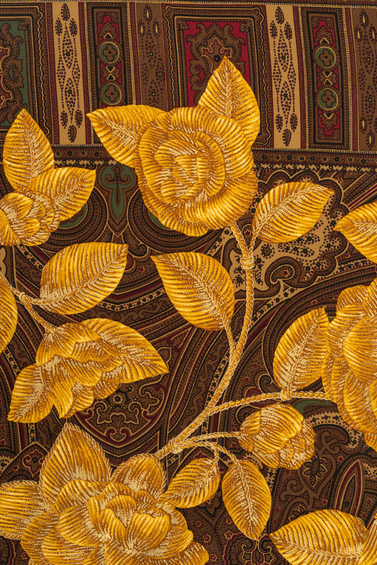 Brown paisley silk scarf with gold flowers throughout.
