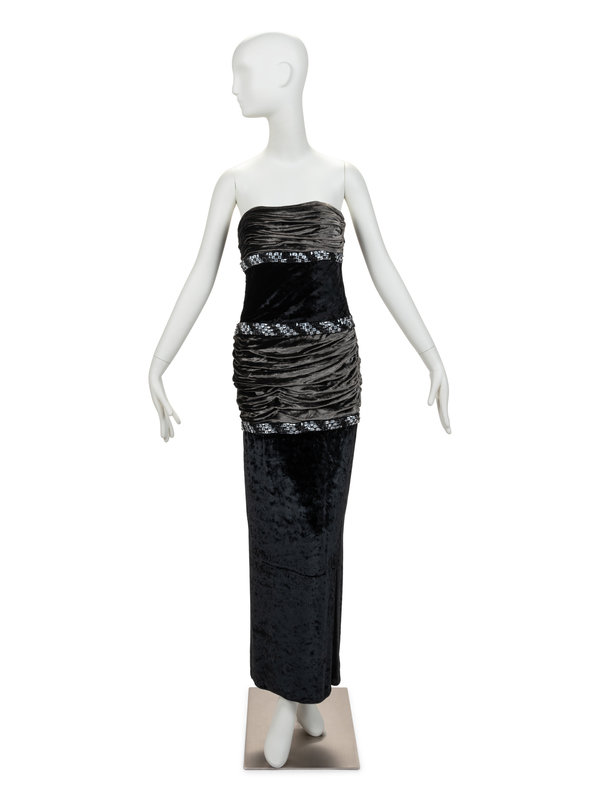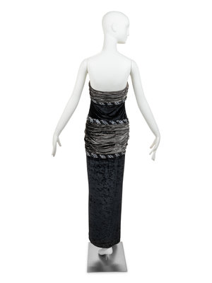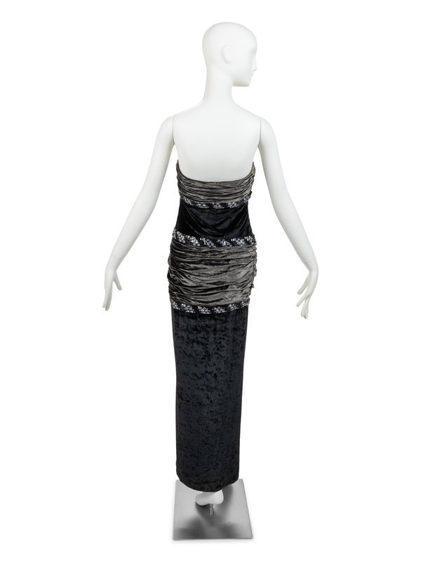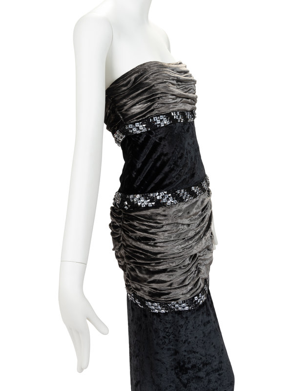 Black and grey paneled velvet strapless dress with ruching details throughout, black and clear beaded stripes, built in boning, side slit, and side zipper closure.