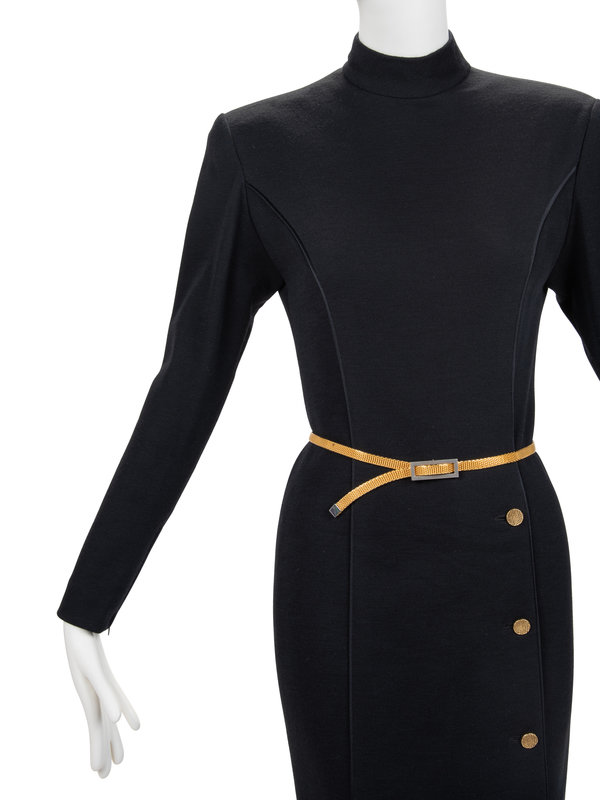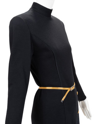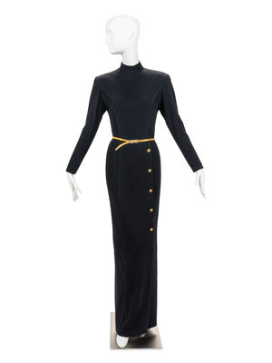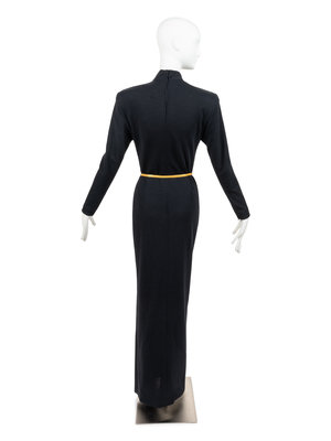 Black wool knit maxi dress with high neckline, set in long sleeves, five off center gold-tone buttons, side slit, center back zipper closure, and matching silver-tone and gold-tone belt. Sample #735, Fall 1988. The belt and buttons are by Tess Sholom.