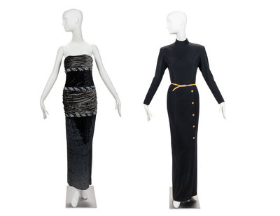 This lot contains two dresses by James Galanos. The knit dress with long sleeves was donated by James Galanos to the consignor and was recorded as 'sample #735', from Fall 1988.
