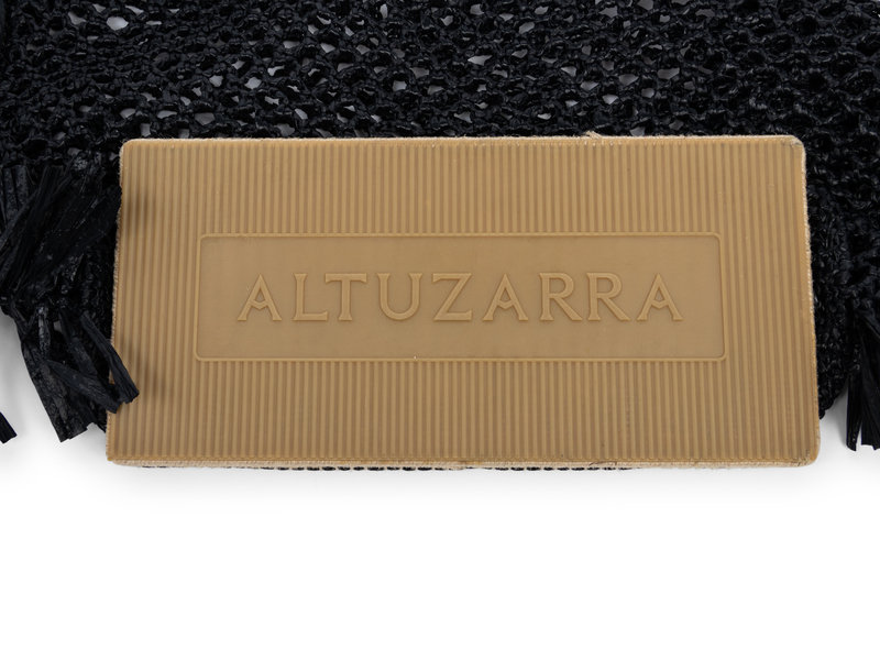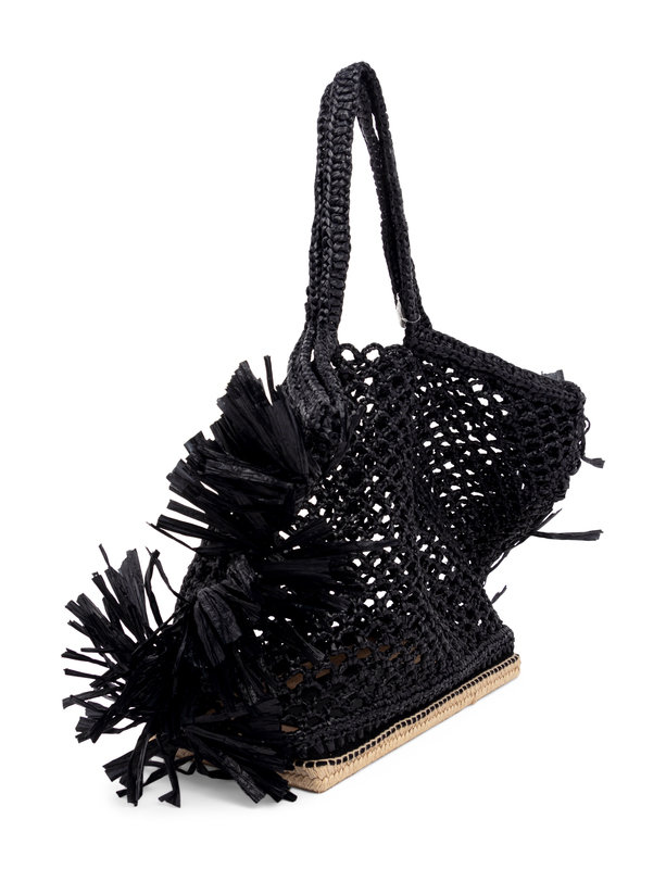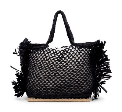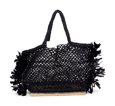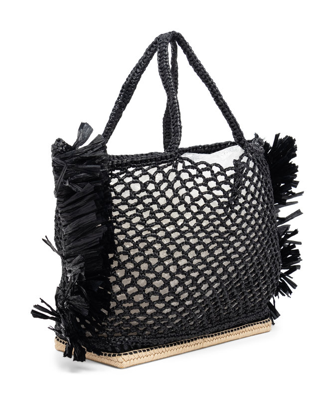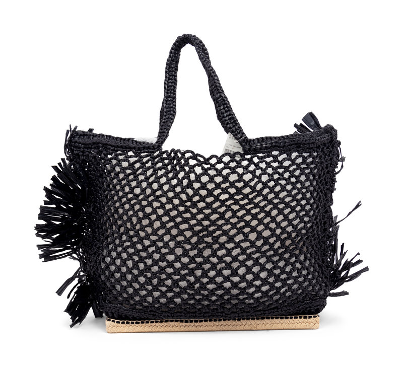 Black woven straw bag with single interior compartment, hardened tan rope and rubber bottom, two matching top handles, black straw side fringe, and open top.