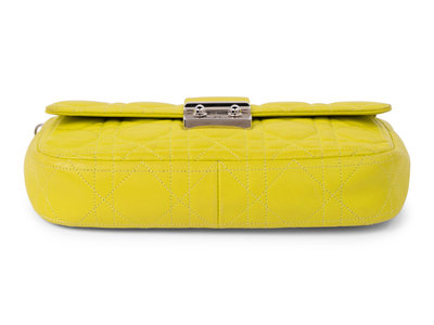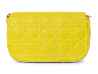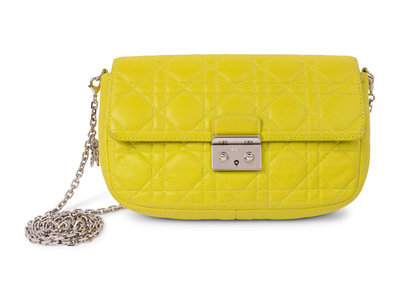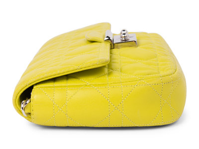 Chartreuse quilted flap bag with a detachable single silver chain shoulder strap, one main compartment with one large slit pocket and six card slots, and a silver-tone metal magnetic buckle closure.