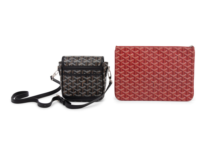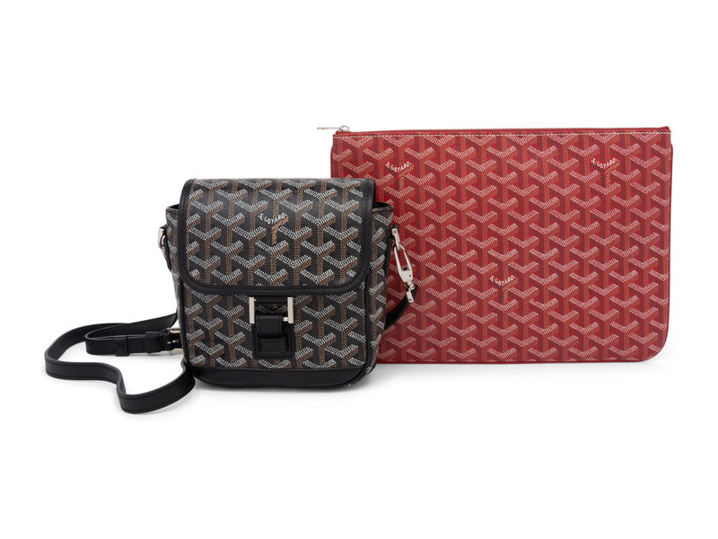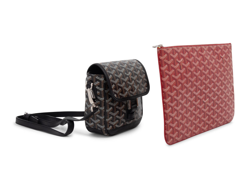 Black, white, and brown Goyardine canvas crossbody with a detachable and adjustable black leather shoulder strap, single compartment interior with slit pocket, exterior back slit pocket, silver-tone metal hardware, and a magnetic front closure.