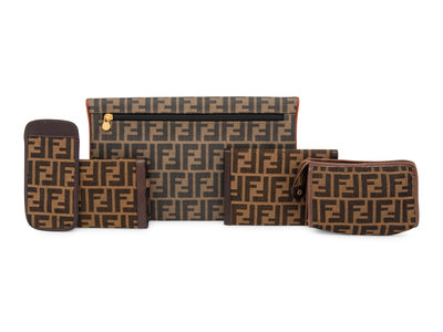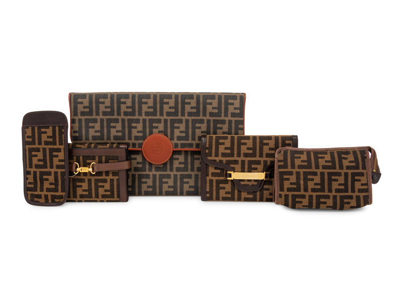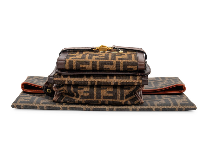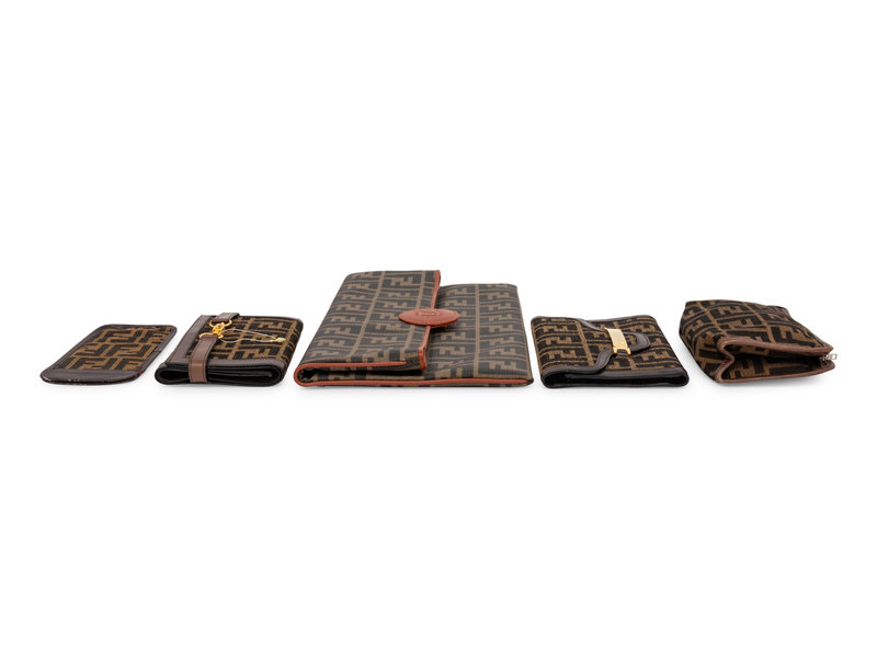 Black and brown monogrammed coated canvas flat fold over pouch with a single interior compartment, a back zippered pocket, and a stamp on the center front with a magnetic snap closure.
