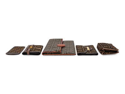 Black and brown monogrammed coated canvas trifold wallet with a zippered compartment, three slit pockets, a snap pouch pocket, an address book, a small pen holder, and a gold-tone bar closure.